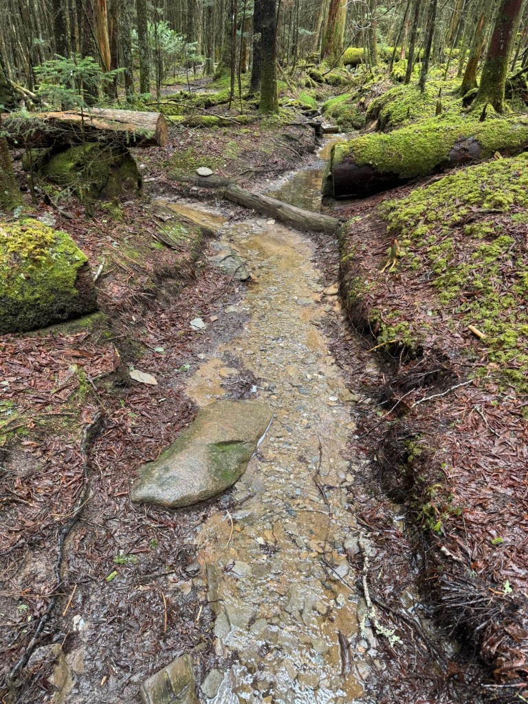 The rain poured down the trail, creating rivers in spots and flowing well over ankle heights in others. There was no longer the option of a dry step, it was just about how wet each step would be.
