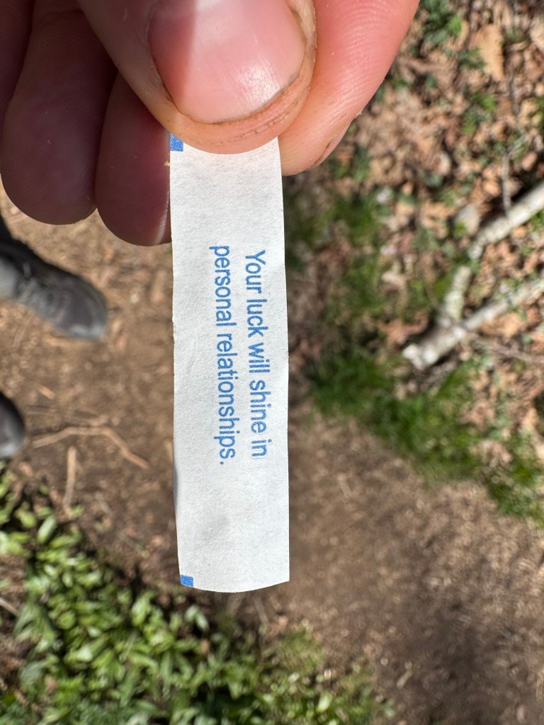 I ran into a couple coming the other way. And when I told them I was through hiking, they gave me a fortune cookie. “Your luck will shine in personal relationships.” That sounded great and all but I really wanted it to say “your feet will move faster soon.”