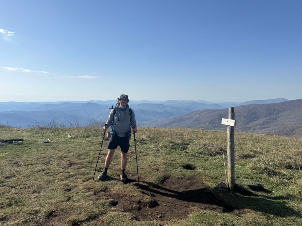 Then began the climb up. I had foolishly thought that since we were done with 6,000 ft mountains we were done climbing. But that was dead wrong. We made our way up a few balds this morning, all with incredible views. I made it to the top of one at the same time as Bugs and Brian. We had a quick celebratory photo shoot before heading down the other side. The wind making conversation hard and the temperature quite cold.