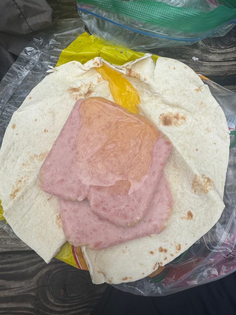 I sat at the shelter with Bugs and made a wrap with the food I had left – a tortilla, two packages of spam, olive oil and some honey. It was delicious and I hoped it would be enough to get me the last 10 miles to town