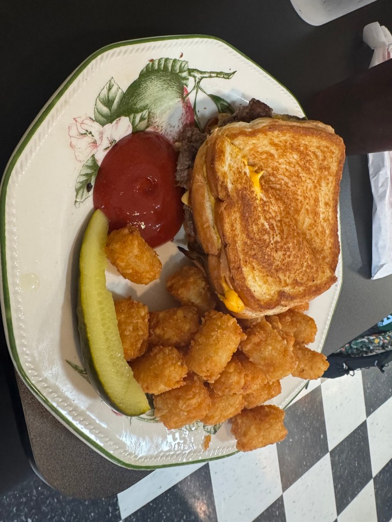 I then went over to the diner to join jackrabbit and bugs (and soon Salt). I ordered the grilled cheese burger – a burger with grilled cheese sandwiches instead of buns. It was as indulgent as you’re thinking and hit the SPOT.