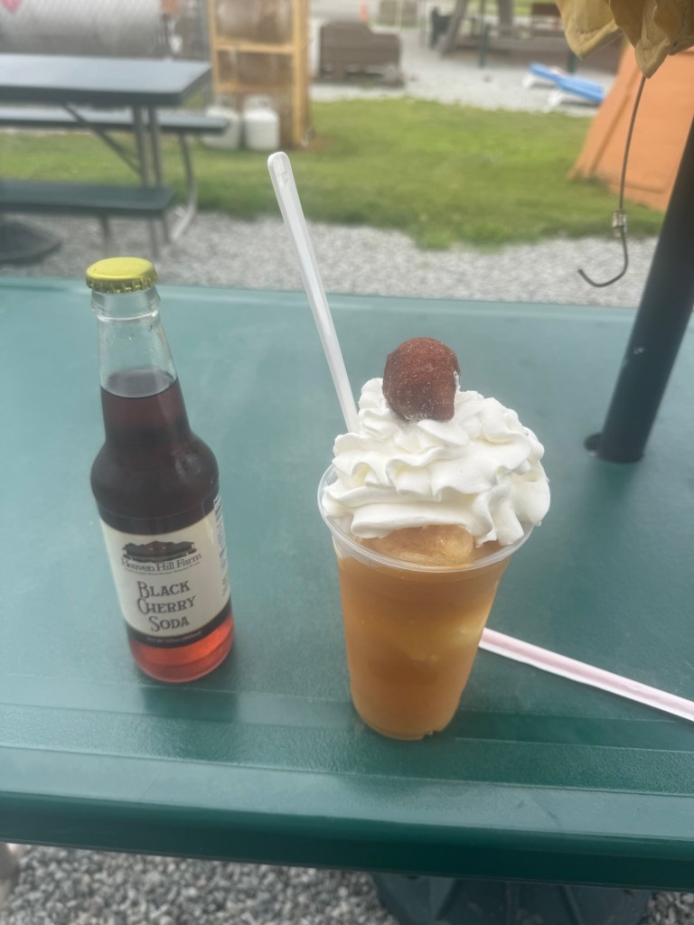When I got to the barn, I saw they had the ultimate cure to the itchiness – a frozen apple cider drink layered in with ice cream, whipped cream and a donut. I ordered a large, then grabbed a homemade soda, some sausage and cheese for later, and reluctantly an apple as well. To make it healthy. Dad joined and got the same cider concoction but seemed to think a Gatorade was a better idea than soda to have on the side.