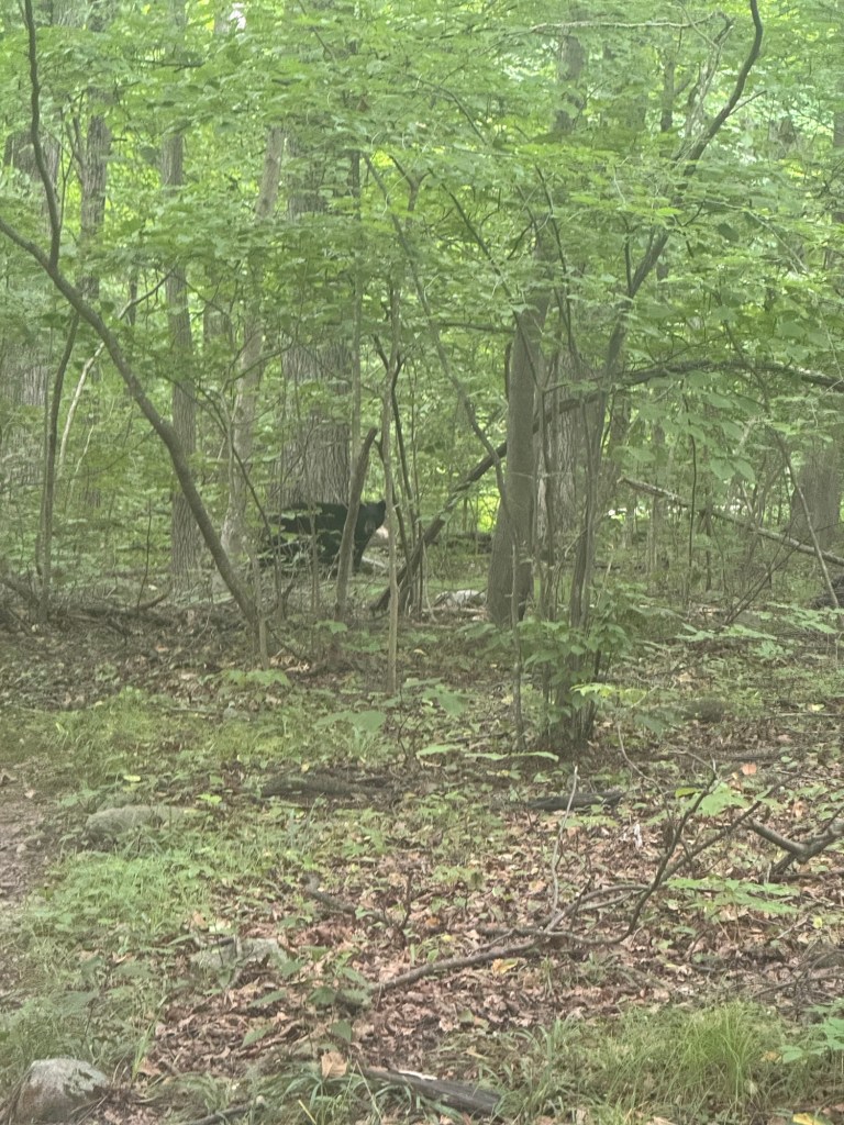 But I didn’t have a choice, so I kept on walking. Through the heat and pea soup consistency air I went until I saw a black shape on the trail in front of me. A bear! He wasn’t big but wasn’t small. Not a menace of a bear but also not a baby that would’ve had a mama around to protect him. So I just stood there watching the bear. He did the same. I took a step forward to get a bit closer and the bear must have been scared by the man in such wet pants. He took off into the woods never to be seen again.